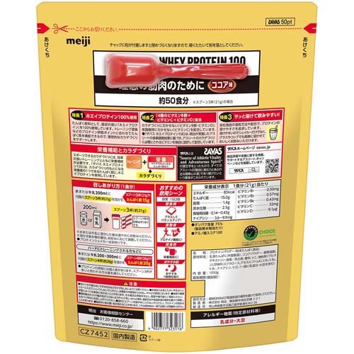 【品名・名称】プロテインパウダー(粉末たんぱく食品)【ザバス ホエイプロテイン100 ココアの原材料】乳清たんぱく、ココアパウダー、植物油脂、デキストリン、食塩/乳化剤、香料、V.C、増粘剤(プルラン)、甘味料(スクラロース、アセスルファムK)、V.B2、V.B6、V.B1、ナイアシン、V.D、(一部に乳成分、大豆を含む)【栄養成分】(1食分(21g)当たり)エネルギー:83kcal、たんぱく質:15.0g、脂質:1.4g、炭水化物:2.5g、食塩相当量:0.14-0.43g、ナイアシン:3.6mg-9.9mg、ビタミンB1:0.50mg、ビタミンB2:0.57mg、ビタミンB6:0.42mg、ビタミンC:32mg、ビタミンD:9.1μg・タンパク含量75%(製品無水物あたり)・アミノ酸スコア100【アレルギー物質】乳成分、大豆【保存方法】直射日光及び高温多湿の場所を避けて保存してください。