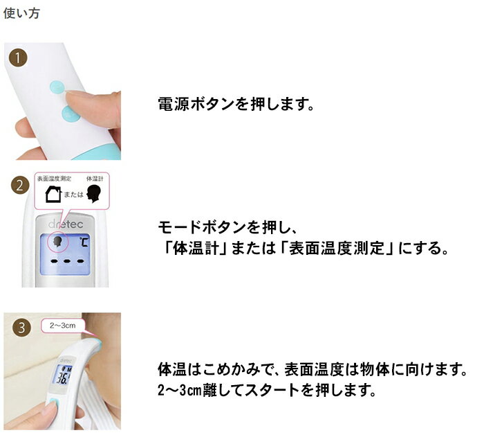 ドリテック 赤外線体温計 TO-401 2色 ピンク ブルー 体温計 早い 赤ちゃん 非接触体温計JANコード:ピンク 4536117025880 ブルー 4536117025897最短約1秒こめかみで測れる非接触体温計■メモリ機能で自動的に保存■周囲の温度を測定■電源の切り忘れに対応のオートオフ機能【仕様】本体サイズ(幅×高さ×奥行き): 約40×150×51mm本体重量: 約74g検知方式: 赤外線(補正方式)測定範囲: 34.0〜42.9℃(体温)、0〜100℃(表面温度)最小単位: 0.1℃測定部位: こめかみ電源: 単4アルカリ電池×2本【送料について】北海道、沖縄、離島は別途送料を頂きます。